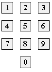 | 17. | Les tecles del meu telèfon estan situades com es veu a la figura. La distància entre els dos centres de dues tecles adjacents (horitzontalment o verticalment) és de 2 cm. Quina és la longitud, en cm, de la línia que resulta de telefonar al número 2616565? |