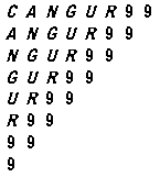 | 19. | De quantes maneres podeu llegir l'expressió CANGUR99 a la figura de la dreta, si per llegir podeu avançar cap a baix o cap a la dreta després de cada lletra? |
