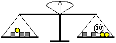 | 22. | La balança que veus a la figura està equilibrada i els 9 pesos dels dos plats (cubs, boles i una bola més grossa que fa 30 g) pesen, en total, 500 g. Quants grams pesa un sol cub? | ![]() |
